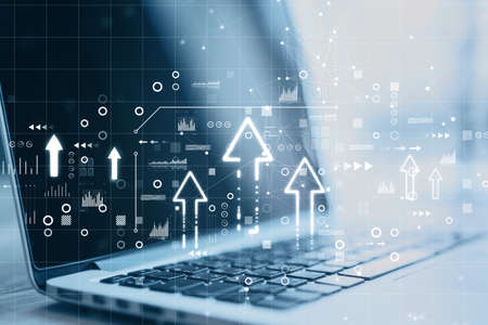 Close up of laptop with abstract glowing arrows on blurry background. Future, business and up concept. Double exposure