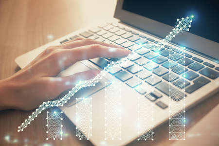 Double exposure of woman hands typing on computer and forex chart hologram drawing. Stock market analysis concept.