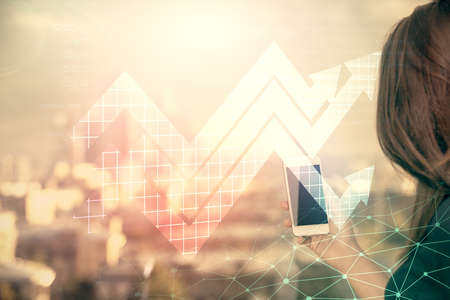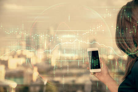 Double exposure of forex chart sketch hologram and woman holding and using a mobile device. Stock market concept.
