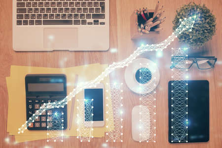 Double exposure of forex chart hologram over desktop with phone. Top view. Mobile trade platform concept.