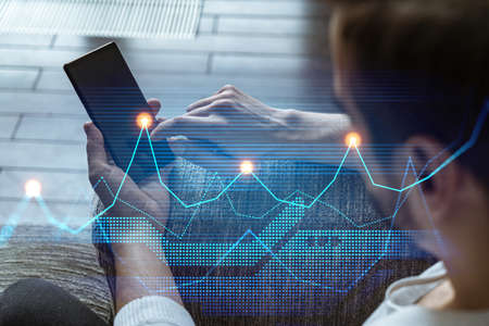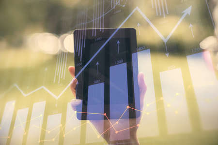 Double exposure of mans hands holding and using a digital device and forex graph drawing. Financial market concept.