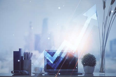 Computer on desktop with point up arrows hologram. Double exposure. Concept of success.