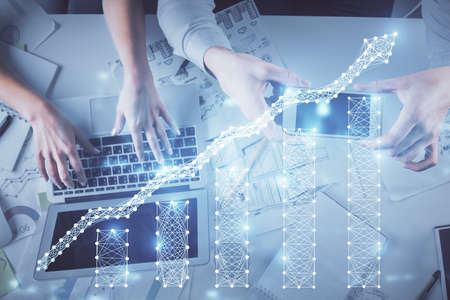 Multi exposure of man and woman working together and forex graph hologram drawing. Financial analysis concept. Computer background. Top View.