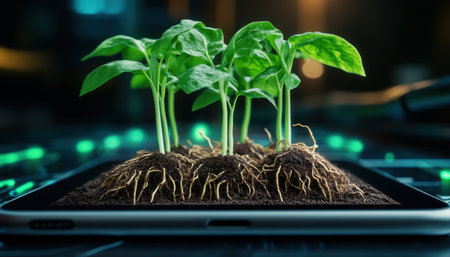 This visually striking image showcases a thriving green plant integrated into a futuristic, tech-driven environment. It represents the intersection of nature, sustainability, and cutting-edge