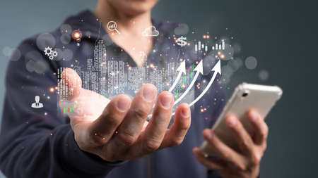 Business planning growth chart increases with Financial Chart on smartphone.Digital communications technology