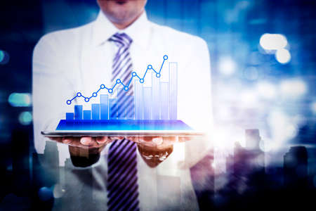 Businessman plan graph growth and increase of chart positive indicators in his business on tablet in hand