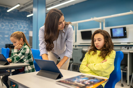 Teacher standing near sad girl sitting at desk