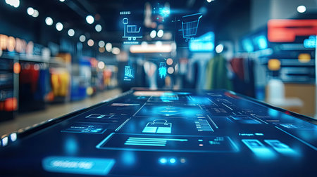 Digital shopping interface with touch screen, no people, clean space for text