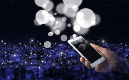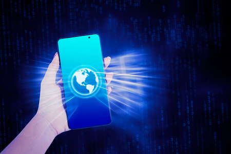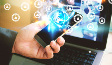 Close up of young man hand using global network app on a mobile phone with virtual screen background