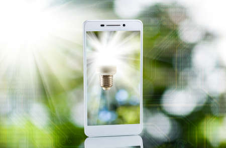 Mockup phone. A man holding a phone with a white screen and a light bulb, investment in ideas, investment in a startup.