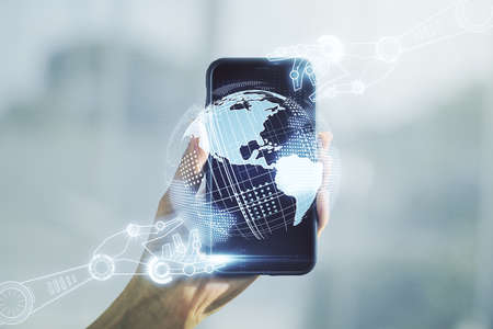 Creative abstract robotics technology hologram with globe and hand with mobile phone on background, artificial intelligence and machine learning concept. Multi exposure