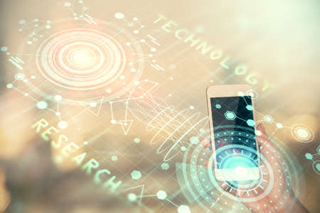 Double exposure of technology sketch hologram and woman holding and using a mobile device. Ai concept