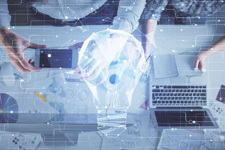 Double exposure of man and woman working together and bulb drawing. Computer background. Top View. Idea concept.