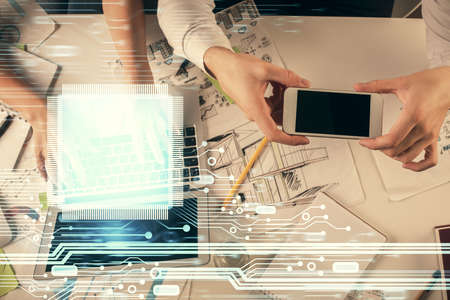 Double exposure of technology sketch hologram and woman holding and using a mobile device.