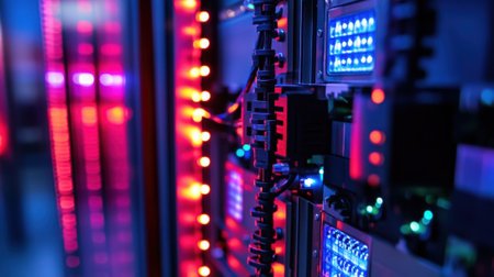 An electronic circuit board and various components are showcased, illuminated by a combination of red and blue light. The image highlights a complex arrangement of wires, panels, and equipment, indicating a possible laboratory or workshop setting. This composition may be suitable for illustrating technology, innovation, or research concepts in commercial contexts.