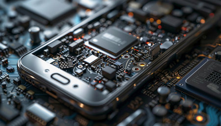 This captivating image showcases a smartphone embedded in a complex circuit board filled with microchips and electronic components, reflecting a modern technological landscape.