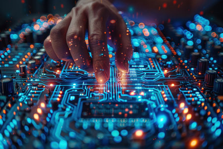 Close-up of hands touching a circuit board, with focus on light and technology.