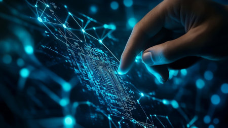 A close-up view of a hand interacting with a digital interface, showcasing vibrant blue lines and nodes representing data connections and advanced technology. Abstract futuristic design. Generative AI
