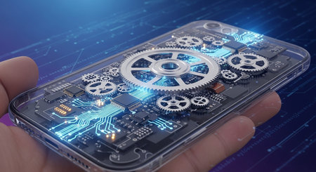 Illustration of modern smartphone with cutting edge technologies of fast internet based on Artificial Intelligence