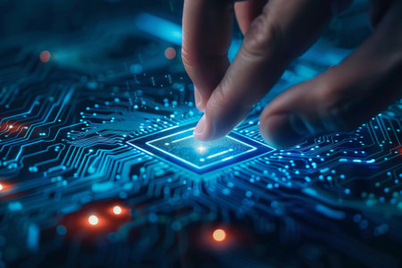 Finger activating a futuristic microchip on a digital screen, enhancing cyber security