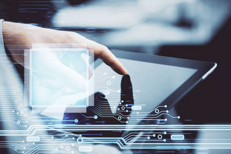 Multi exposure of man's hand holding and using a digital device and data theme drawing. Innovation concept.