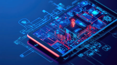 A sleek smartphone displaying vibrant digital icons and data patterns, embodying modern technology and innovation in a captivating high-tech setting.