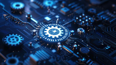 This detailed image showcases a close-up view of a high-tech circuit board illuminated by blue lights, creating an abstract digital landscape. The soft bokeh effect enhances the futuristic feel of the design.