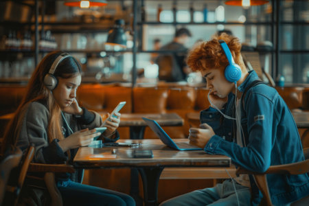 Two people using two mobile phone sharing USB Power Bank on a table to charge the mobile devices.Technology device charge sharing concept.
