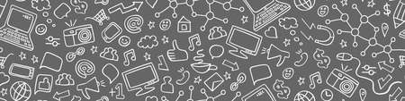 Social media doodles seamless horizontal border. White pictograms on gray background. Vector illustration.