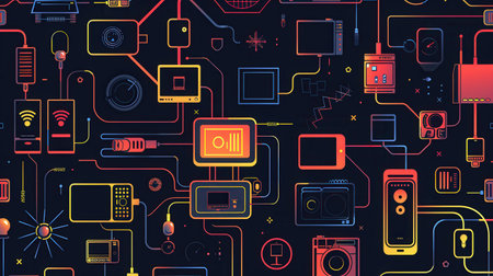 An abstract illustration depicting various network devices, such as routers, modems, and smart home gadgets, interconnected by colorful lines symbolizing data flow.