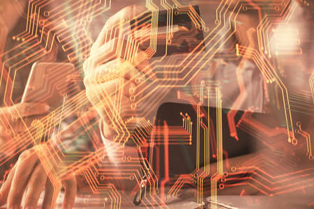 Double exposure of woman hands typing on computer and technology theme drawing. High Tech concept.