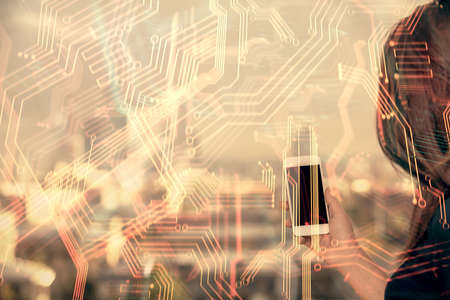 Double exposure of technology sketch hologram and woman holding and using a mobile device.
