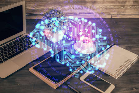 Double exposure of creative artificial Intelligence symbol with modern laptop on background. Neural networks and machine learning concept