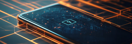 The smartphone rests on a sleek surface, showing a vibrant digital lock icon that highlights its security mechanisms and design.
