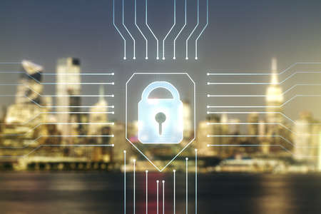 Double exposure of virtual creative lock hologram with chip on blurry cityscape background. Information security concept