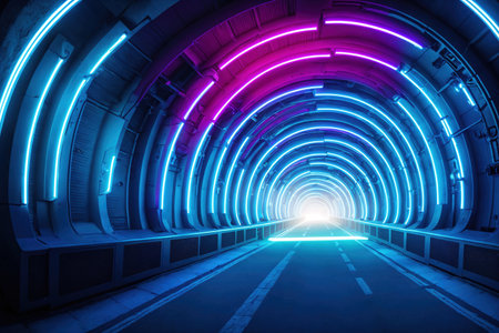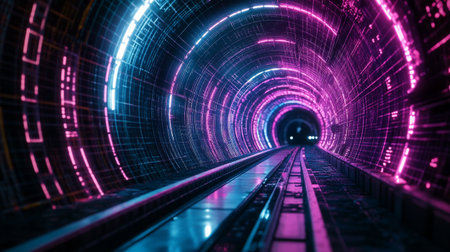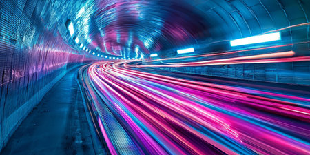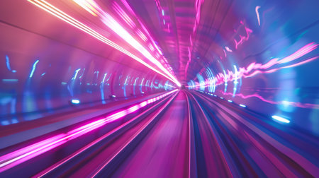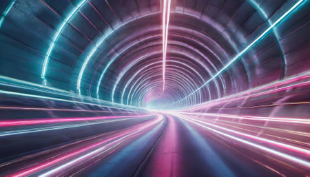 This captivating image showcases a tunnel illuminated by colorful neon lights, creating a dynamic and energetic atmosphere at night. The light trails symbolize motion and speed, reflecting creativity in urban design.