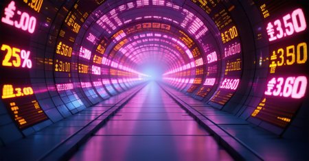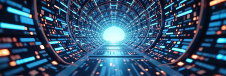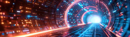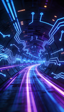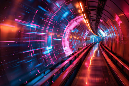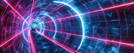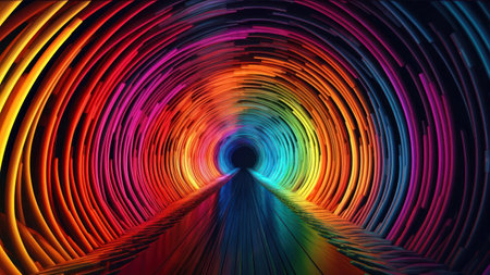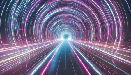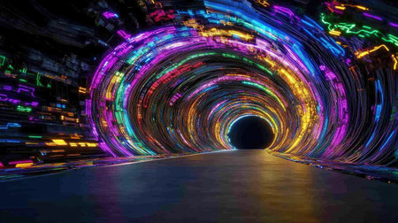 Neonlit tunnel with swirling digital patterns, futuristic and vibrant