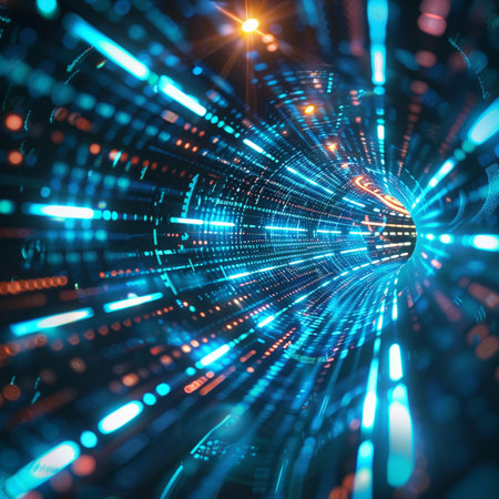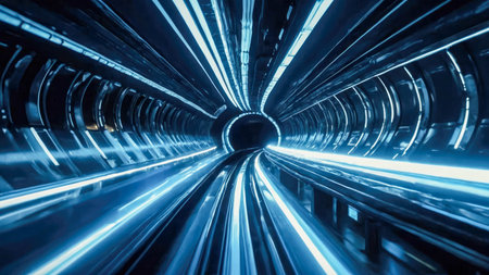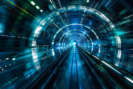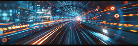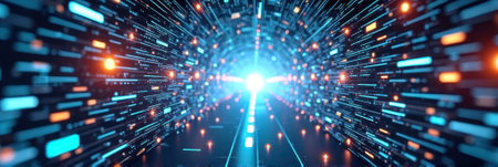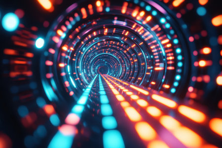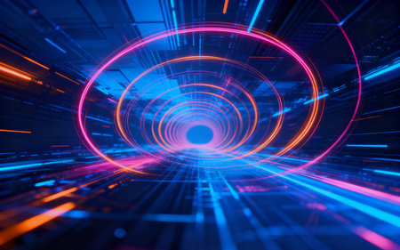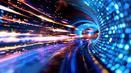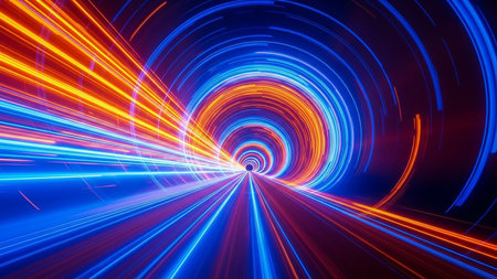 An abstract representation of a tunnel filled with swirling trails of vibrant blue and orange light. The streaks of light create a sense of immense speed and motion, the viewer into a futuristic...