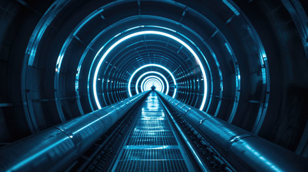 Futuristic tunnel with glowing blue lights and metallic structure, technology and innovation concept