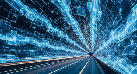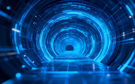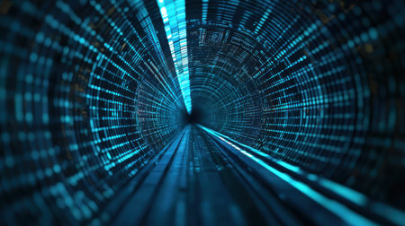 Abstract digital tunnel with glowing blue lines and binary data flow creating a futuristic tunnel perspective for technology, innovation, and connectivity themes