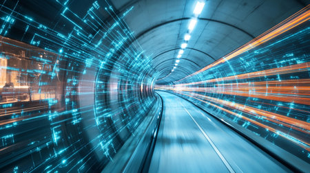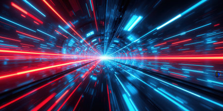 High-Speed Data Tunnels - A futuristic tunnel illuminated by streaks of neon blue and red light, representing the rapid movement