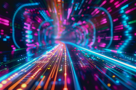 This stunning image portrays a colorful digital tunnel filled with vibrant light trails, creating an abstract and captivating scene perfect for artistic projects.