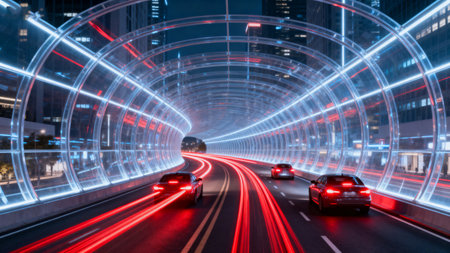 A striking image of a futuristic tunnel illuminated by dynamic light trails, creating an impression of speed and motion. Ideal for themes of technology and journey.