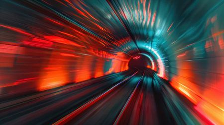 Embark on a vibrant highspeed journey through a futuristic tunnel, illuminated by neon lights and dynamic motion blur effects. Ideal for themes such as technology, scifi, and innovation