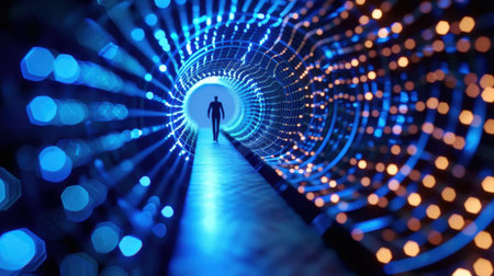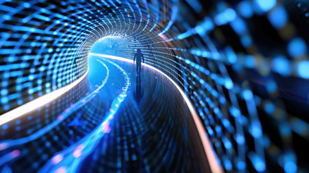 This image features a stunning abstract digital tunnel illuminated by vibrant blue lights, creating a sense of depth and movement. A silhouetted figure symbolizes a journey through technology.