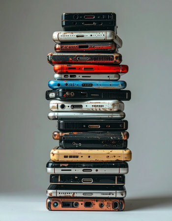 A towering stack of old and obsolete smartphones stands as a monument to the rapid evolution of mobile technology.