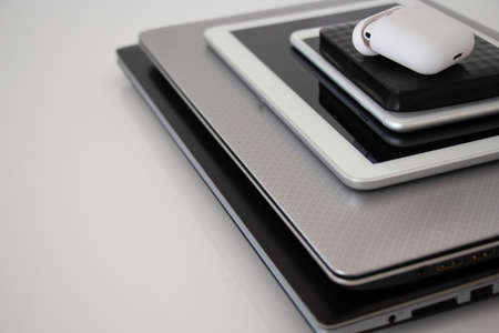 Stack of Hard Disk Drives. Pile of assembled hard drives. Isolated on white. soft focus