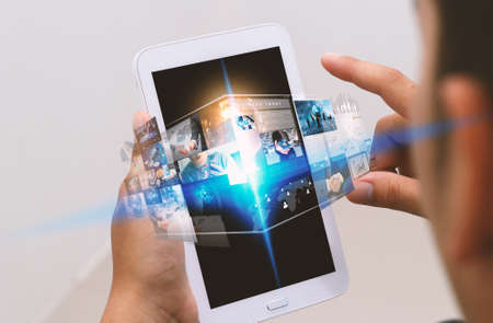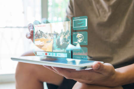 Man or Male use Digital Wireless Touch Screen Tablet Device with LIve Video Streaming Tele conference Meeting and Analyze Stock Data, Weather forecast, Navigation system and Investment as Modern Lifestyle Technology Concept.