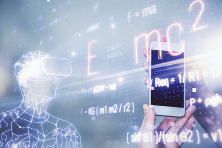 Double exposure of man's hands holding and using a phone and formulas drawing. Education concept.