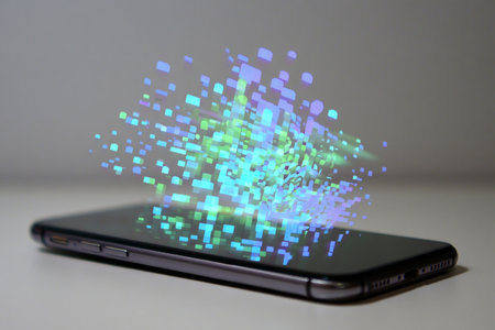 Futuristic smart phone with a colorful binary code flying out of the screen